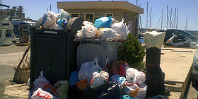 Problemi evidenti nel porto catalano, proprio in prossimità del distributore di carburanti. Cassonetti stracolmi di buste e scarti di ogni genere