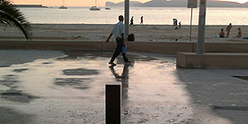 L´acqua riversata sulla passeggiata scorre fino a trovare il mare. L´allagamento potrebbe essere causato dalla rottura di una fontanella