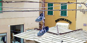Nella foto: l scarpe appese in via Roma ad Alghero