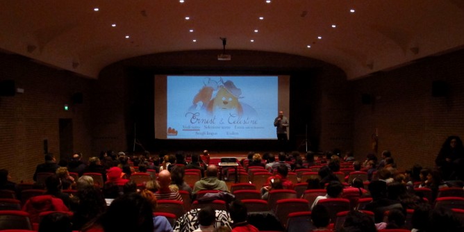 PORTO TORRES - Una sala Filippo Canu gremita di bambini e famiglie ha assistito venerdì alla proiezione del film «Ernest & Celestine», inserita nel programma della rassegna Cinepandoro organizzata da La Camera Chiara con il contributo economico dell’Amministrazione Comunale di Porto Torres. Un bellissimo film di animazione che ha affascinato gli spettatori più piccoli come quelli più grandi. Un poetico disegno fuori dal tempo, un acquerello magico e una storia piena di poesia e azione. Un film per gli adulti che hanno voglia di imparare dai bambini con due protagonisti pieni di coraggio paladini del super potere più bello di tutti, quello di inseguire a tutti i costi e muso in alto le proprie aspirazioni e farsi guidare dall’amore.