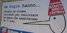 ALGHERO - Un tempo la politica si faceva in piazza. La televisione a livello nazionale e regionale oggi ci ha abituato ad accesi dibattiti tra fronti opposti. Mentre ad Alghero i muri suppliscono egregiamente alla mancanza di un contatto diretto tra chi fa politica e la città. Dopo gli attacchi murari dei rappresentanti sardisti e di centro sinistra, le pareti di Alghero danno voce alla controparte. Sono firmati da Forza Italia infatti le gigantografie affisse nei punti strategici della città per replicare agli avversari politici. Impossibile non notarli. A parte le dimensioni, il soggetto raffigurato farebbe pensare a una rappresentazione teatrale incentrata sulla favola di Pinocchio. Invece il burattino di Collodi presta la sua immagine ai forzisti per sferrare la controffensiva agli avversari politici, descrivendoli palesemente come dei bugiardi. «Scusate se stiamo lavorando per realizzare le opere che aspettavamo da vent’anni», è il lapidario messaggio pensato su uno sfondo bianco, incorniciato nella parte sottostante da una fascia azzurra dove campeggia la scritta «Alghero, forza».